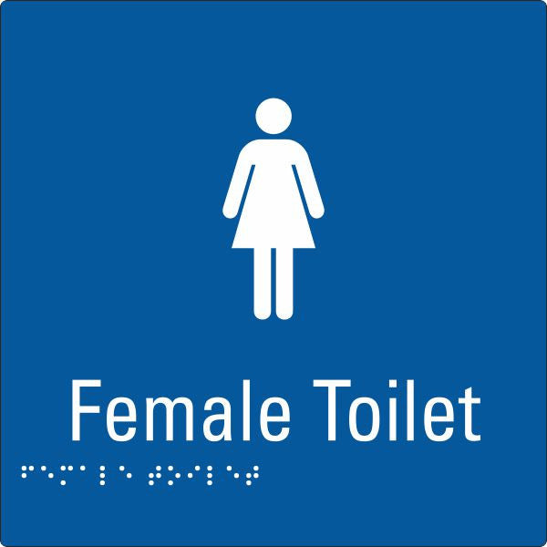 Female Toilet blue Braille Sign has been moulded from a single piece of polycarbonate. The braille and tactile elements are all raised so that they comply with the building code and the print is on the reverse side of the sign face, preventing it from being scratched off. Being a fully moulded sign none of the braille or raised elements will fall off. This is a major advantage over the traditional braille signs, which have individual braille and tactile elements glued to the face of the sign. The signs have a multi layered construction with the polycarbonate face mounted onto a semi-rigid polyethylene plastic backing plate. The polycarbonate is vandal and fade resistant, making the sign suitable for the indoor and outdoor use. They are supplied with 3M 467 M double sided tape applied to 100% of the back of the sign, ready for installation. The signs are suitable to be mounted directly to flat surfaces such as gyprock, painted timber, glass etc.