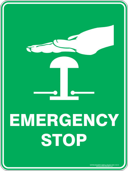 This Emergency EMERGENCY STOP BUTTON Sign is available in a variety of sizes and materials.